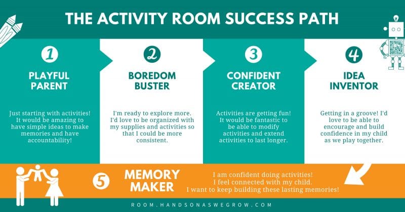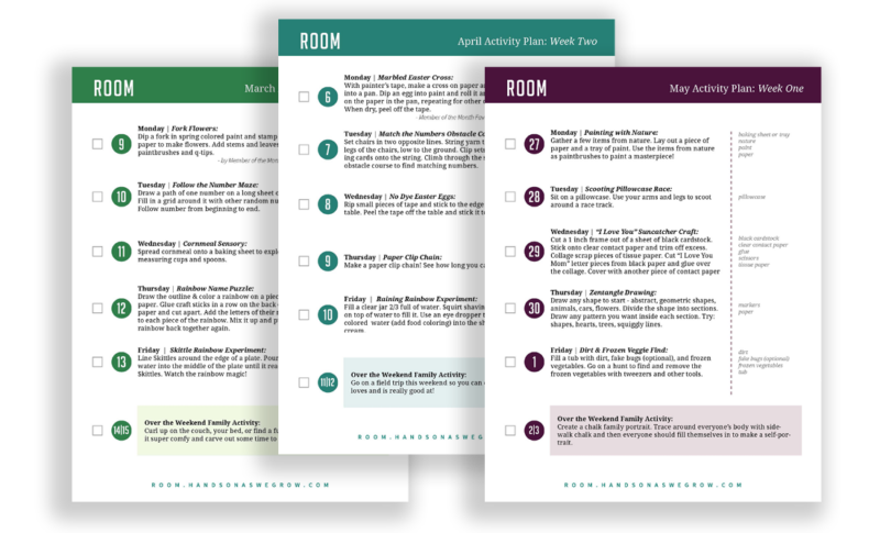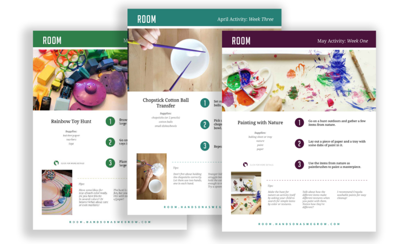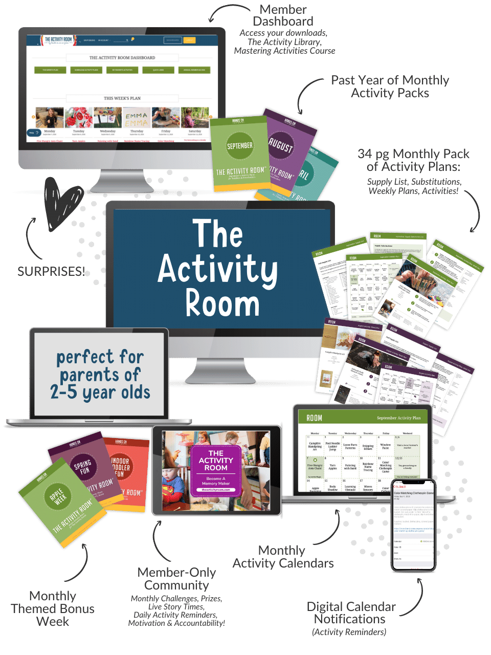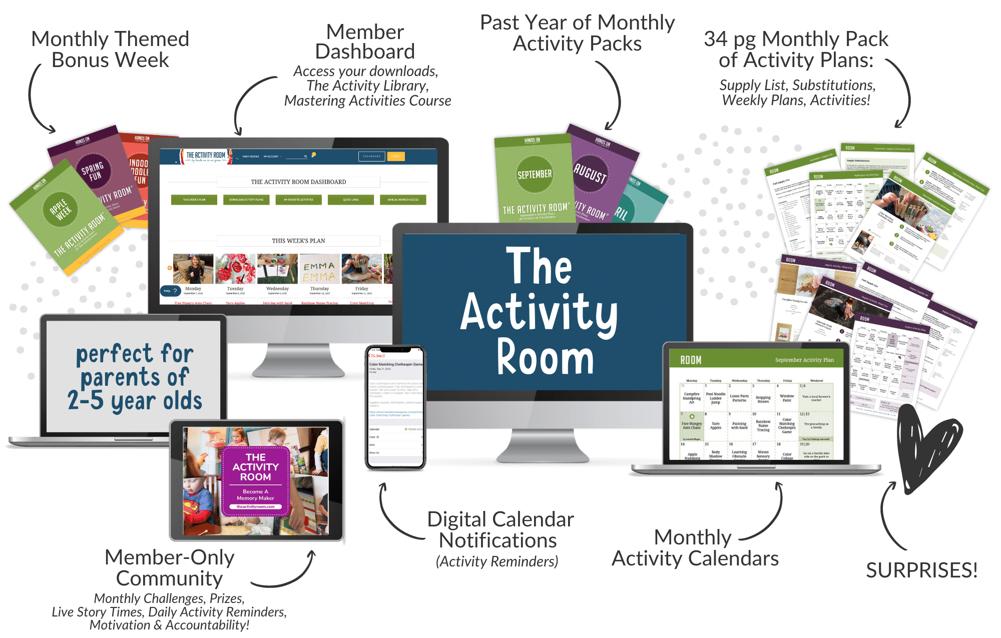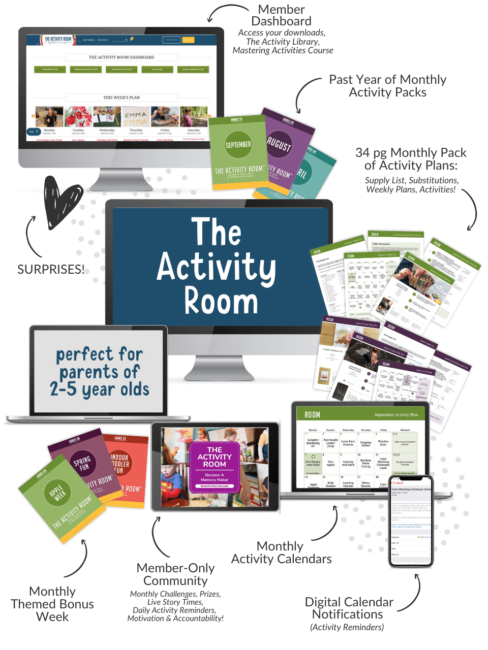 Inside of The Activity Room, we deliver activities that are designed for 2 to 5 year olds, right to your inbox every week — much like a meal plan would! The Activity Room is an online monthly program that is designed to help moms, dads and grandparents caring for toddlers and preschoolers — to simplify being a ‘good’ and fun parent — every day. It runs much like a meal planning service does, but with activities! How fun! The problem? There is always so much to do, that activities get put on the back burner. And time slips away. There is so much pressure on us as parents to create this memorable childhood with all the bells and whistles. Spending an extravagant amount of time on researching, planning and setting up activities is a giant waste of your limited time (and stressful)! ⭐⭐⭐⭐⭐ “Confession time. I am addicted to Pinterest. In fact, I have 23,049 pins as of now, and that number grows daily. Out of all the activity ideas for kids I’ve pinned, I’ve actually done exactly ZERO of them with my daughter. I tend to be a perfectionist and put pressure on myself for everything to look Instagram-worthy, but what ends up happening is I’m frozen and don’t move forward with anything because I don’t have all the pieces in place. Thank you for helping put a fire under me to actually DO something instead of PLANNING on doing something ‘someday’.” Sarah Mehta ⭐⭐⭐⭐⭐ “I’m a single mom who works full time. I joined to create memories and make the most of our quality time together. I find I now look forward to doing activities every day, before I was planning but didn’t have time for all the prep. The activities I have done so far have all been items I have in the house.” Leah Duncan Save 5 to 8 hours (and the headache) of searching and planning each month with a monthly activity calendar comprised of “doable” activities for your toddler or preschooler, with supplies you have on hand. Don’t run to the store for crazy supplies! The Supply list includes all the supplies you’ll need for each month; you probably have most of these on hand! But just to be certain, we’ve made it easy for you to check the list complete with supply substitutions– so you’re ready for the whole month. Easy and quick access to each week of activities (plus it’s supply list)! Each week is on one sheet of paper, making it easy to print out and pin it up for the week and have a simple place to come back and check off that you did the activities gives you a sense of accomplishment. Don’t waste any more of your time! Each activity is explained in 2-3 short sentences, with a separate detailed explanation page of each activity, with images. ⭐⭐⭐⭐⭐ “Thanks to your fun, simple, creative activities, we have fun bonding and learning every morning! And when my big one comes home, we start again with something new! So thank you for helping me be the best, most fun and present mom for my two girls!” Nechama Sova Whether you’re starting out as a Positive Playmate looking for ideas to do or already a Memory Maker feeling confident and connected with your child. You’ll have an action plan to become and maintain Memory Maker status, no matter where you are on your journey that we have laid out with action steps to progress further. Browse the last 12 month’s of activity plans to grab any activity to do along the way. Get an extra week of activities each month to do with your child! Bonus weeks are delivered to annual members on different themes each month: fine motor, gross motor, Spring fun, learn a letter, and so on! A complete catalog of activities for you to check out and grab an activity to do at any time. Look up an activity by age, by type of activity, or by season or holiday. Get inspired and be motivated to keep on track with access to a private Facebook group to connect with other members of The Activity Room. Daily prompts of the activity to do with your kids right at your hands when you need it. Via your preference of emails, calendar reminders, or in our very own members-only community on Facebook. Discover the ins and outs of doing activities with your child: juggling multiple kids, saying yes to the mess, conquering a small space! These cards include 60 of our favorite tried-and-true activities to have on hand for those spur of the moment activities: gross motor, fine motor, sensory, arts and crafts, science experiments and just plain fun! Photos, tips, and how to do the activity are on one 4×6 index card to print them off. ⭐⭐⭐⭐⭐ “So grateful for The Activity Room and all it’s wonderful members. This ROOM has really helped me create a lot of wonderful moments with these little guys and has also helped the oldest start to really think out of the box and start creating his own activities for us all to do. He isn’t a sit down and work in a workbook type kid so all these other hands on learning ideas have really helped him a lot. And the youngest is learning a whole lot more at a young age because he loves to do whatever big brother is doing. So thank you to all of you!” – Jen Corbett If you sign up with the monthly plan and you’re not 100% satisfied with The Activity Room, the done-for-you plans, or the support, you can cancel anytime! No strings attached. If you sign up for the yearly plan, and decide it’s not a good fit within 30 days, I will offer you a full refund, hands-on mom’s promise. Make your payment today, and you don’t even have to decide if you’re in for good! Take the full 30 days to explore the materials and experience the community and THEN… make a decision using the information YOU HAVE, rather than the information you don’t. ⭐⭐⭐⭐⭐ “For anyone sitting on the fence wondering if it’s worth it, here’s my experience. I debated the opportunity and chose to opt out, thinking that I’d use the awesome resources already available. I did once or twice after the challenges ended. But th